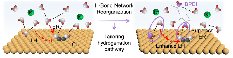 interfacial hydrogen-bond networks without altering catalyst electronic properties.In situ Raman spectroscopy captures enhanced *OCHCH2/*OCHCH3 intermediates, directly correlating ethanol selectivity with suppressed ER pathway. Combined experimental and theoreti calstudies establish quantitative relationships between hydrogen-bond strength and pathway selectivity. This strategy achieves 38.7% ethanol Faradaic efficiency (FE) at 900 mA cm−2 on CuO-derived catalysts (116% improvement) and 53% at 800 mA cm−2 on CuAg systems—among the highest reported efficiencies. Our findings reveal that controlling competitive hydrogenation pathways through interfacial engineering provides an independent parameter for steering CO2 reduction selectivity.